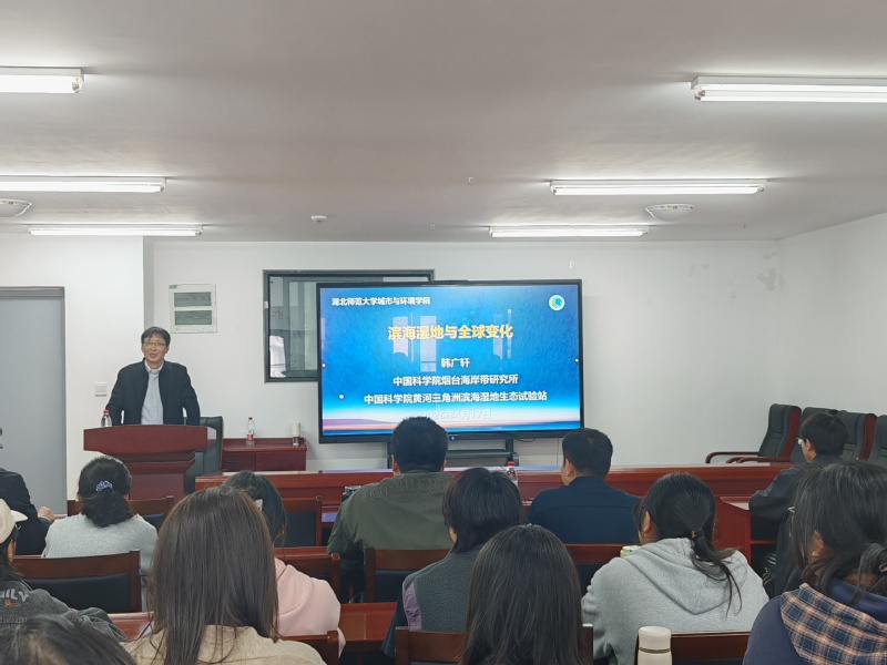 下午,韩广轩研究员在资环大楼7406会议室作了题为“滨海湿地与全球变化”的报告。报告会由葛绪广副教授主持,学院相关方向教师、自然地理学专业硕士研究生和部分本科生共50余人参加了报告会。韩广轩从战略背景与意义、研究进展与趋势和面临挑战与建议等三个层面,系统阐述了海滨湿地与全球变化研究的前沿动态。报告内容兼具理论深度与实践指导价值。在互动环节,他围绕滨海湿地保护热点问题、研究生学习生涯规划、考博专业选择等话题,与师生们展开了深入交流。他结合生动的案例,鼓励大家要坐得住“冷板凳”,同时始终关注国家和地方的重大需求,积极倡导学科交叉融合,善于运用新方法与新技术,唯有如此,科研成果才能真正做到厚积薄发。讲座在热烈的掌声中圆满结束。