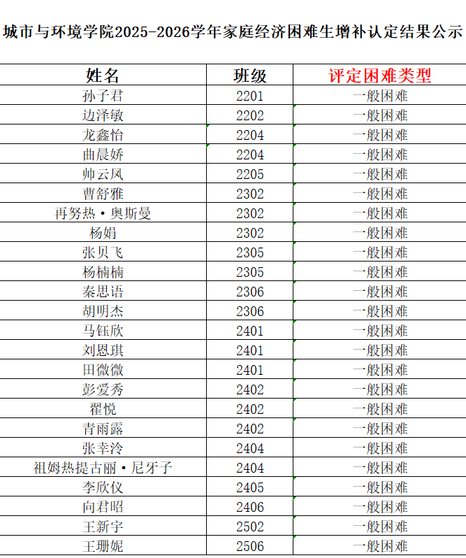 根据《关于做好2025-2026学年家庭经济困难学生认定工作的通知》文件精神,六合宝典下载ios 2025-2026学年贫困生认定工作已经结束,后经学生申请,班级民主评议,学院审核通过增补入库一批家庭经济困难学生,现将认定结果进行公示。